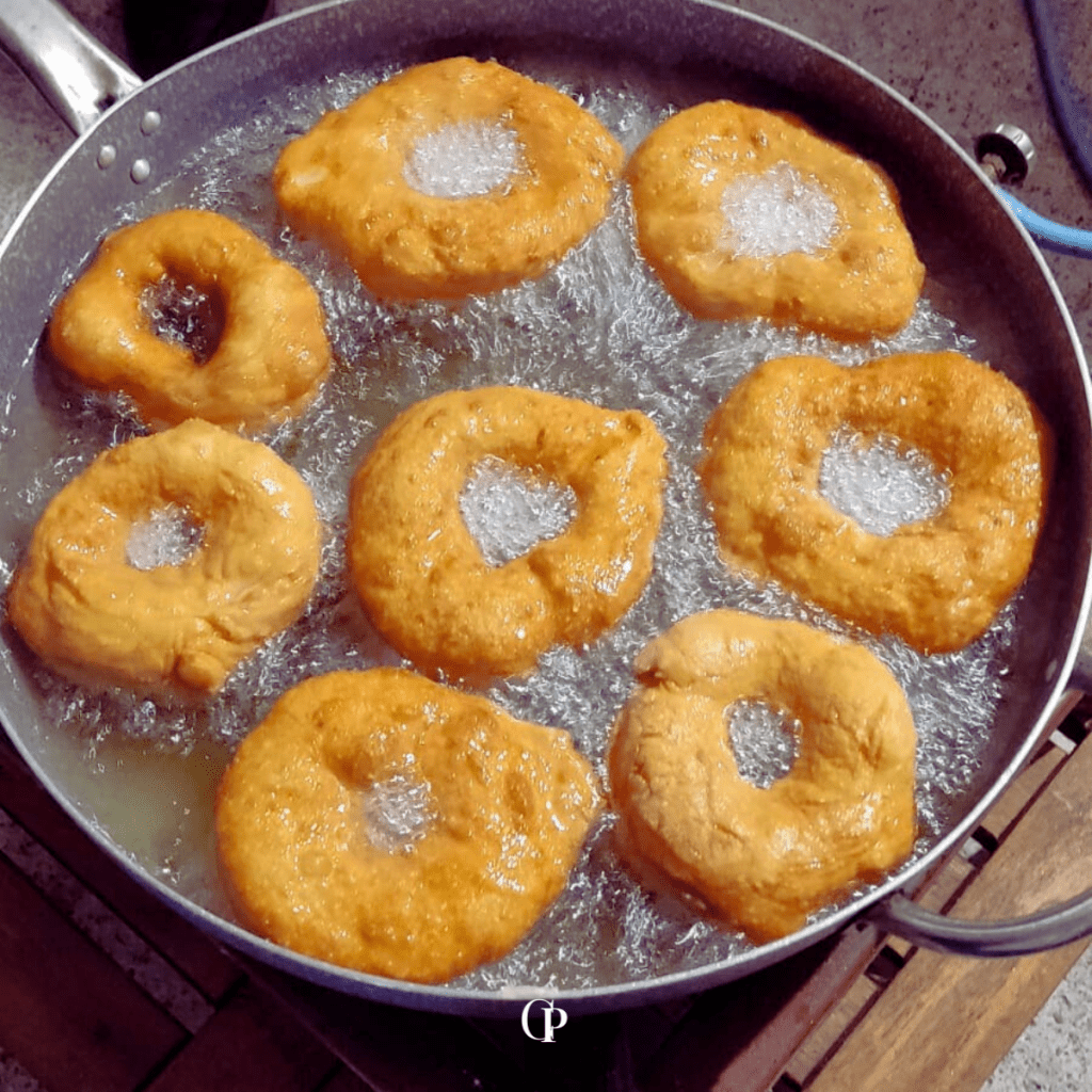 Comenzamos con la bandeja de las donas de papas, hermosamente levitadas, a las que hay que abrirles un hueco en el centro y agrandar lo suficiente para que mantengan su forma y su cocción sea impecable, y lo logramos. Estas se pueden comer en formato dulce, con azúcar regular o glas por encima, o en formato natural salado, para acompañar fiambres locales y quesos.