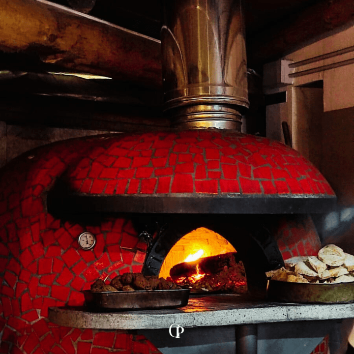 No tardaron en llegar con el antipasto, compuesto de quesos frescos, aceitunas, salame de la zona y albóndigas de berenjenas. Mientras esperábamos el primer plato, me acerqué al horno para ver salir las bandejas de lasaña, la coliflor gratinada, las papas con romero y el asado de carne de cerdo en su propia salsa. Está de más decir que el olor en todo el espacio incitaba a comer y comer… y comer.