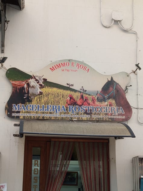 Comimos en la carnicería y rosticería Mimmo y Rosa, que atiende a los peregrinos que están de paso por la zona, estos forman parte de algo parecido al Camino de Santiago, que se hace en A Coruña, España. El menú consiste en varias degustaciones en varios tiempos. Empezamos con un antipasto de fiambres y quesos locales artesanales y un carpaccio de carne deliciosos. El corte del carpaccio era más grueso de los que he comido hasta ahora, sin embargo, se deshacía en la boca como si fuera una tela. ¡Absolutamente sabroso y suave!
